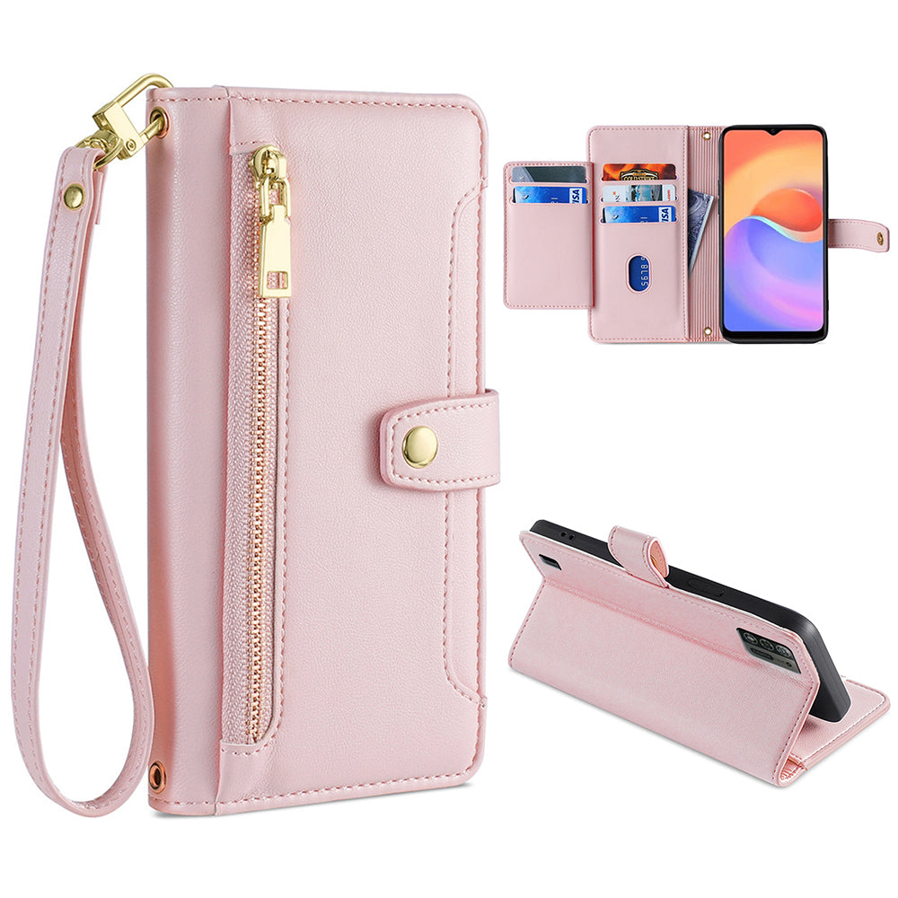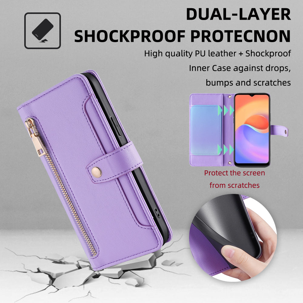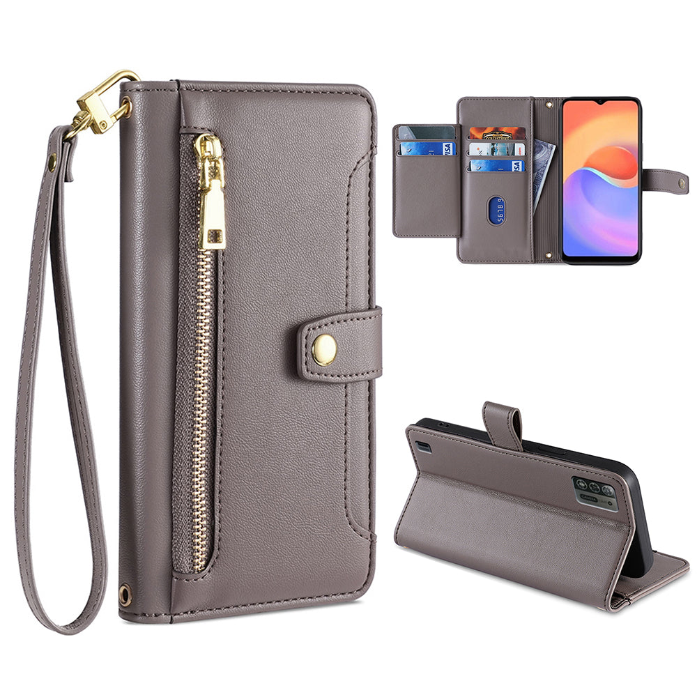 For ZTE Blade A52 Lite 4G Full Protection PU Leather Stand Case Zipper Pocket Card Slots Flip Phone Cover with Wrist Strap and Shoulder Strap