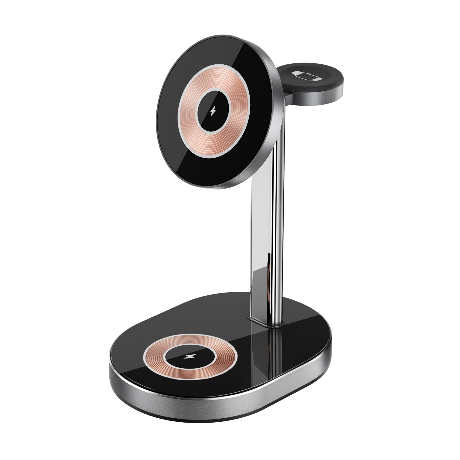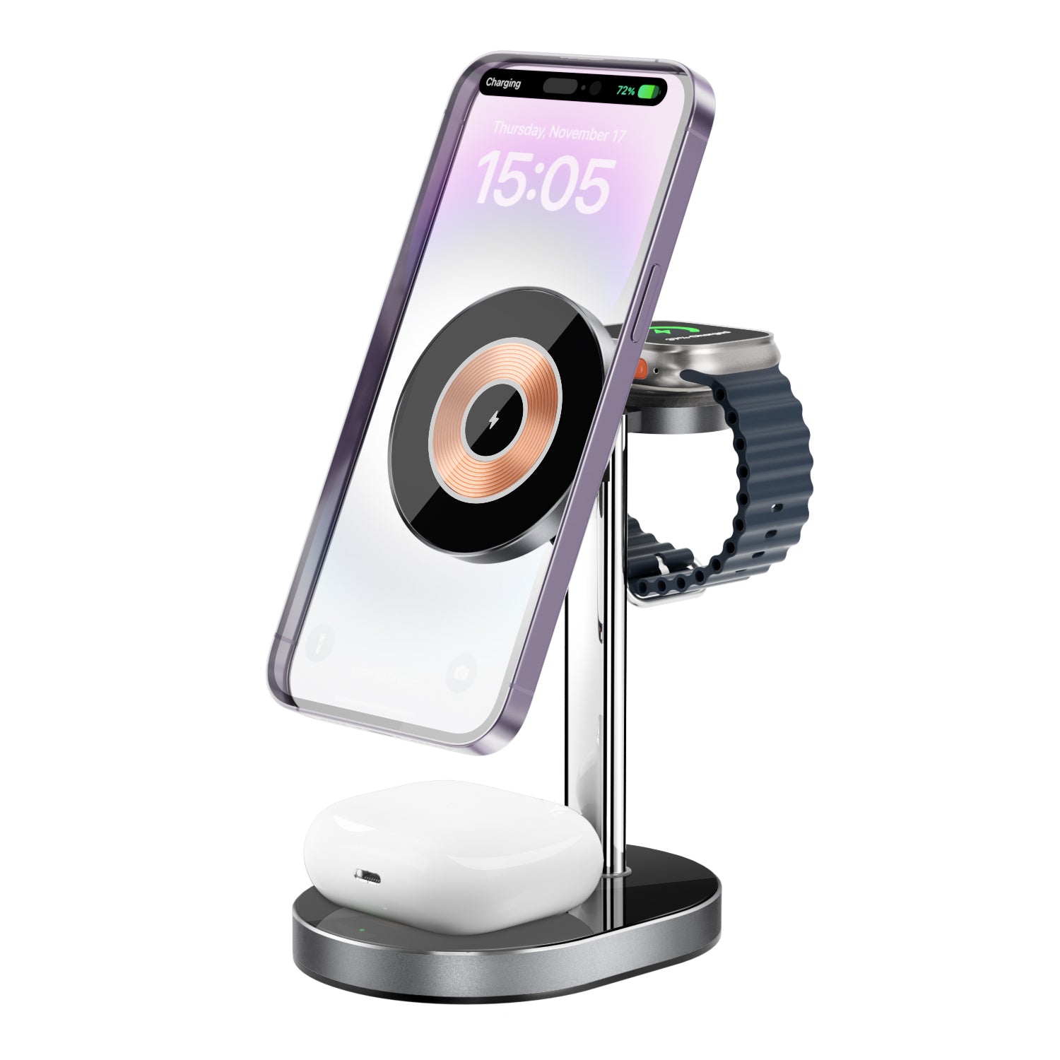 - 3-in-1 design, supports magnetic wireless charging for iPhone 12-15 series, wireless charging for Apple watches, and support for Airpods that support wireless charging