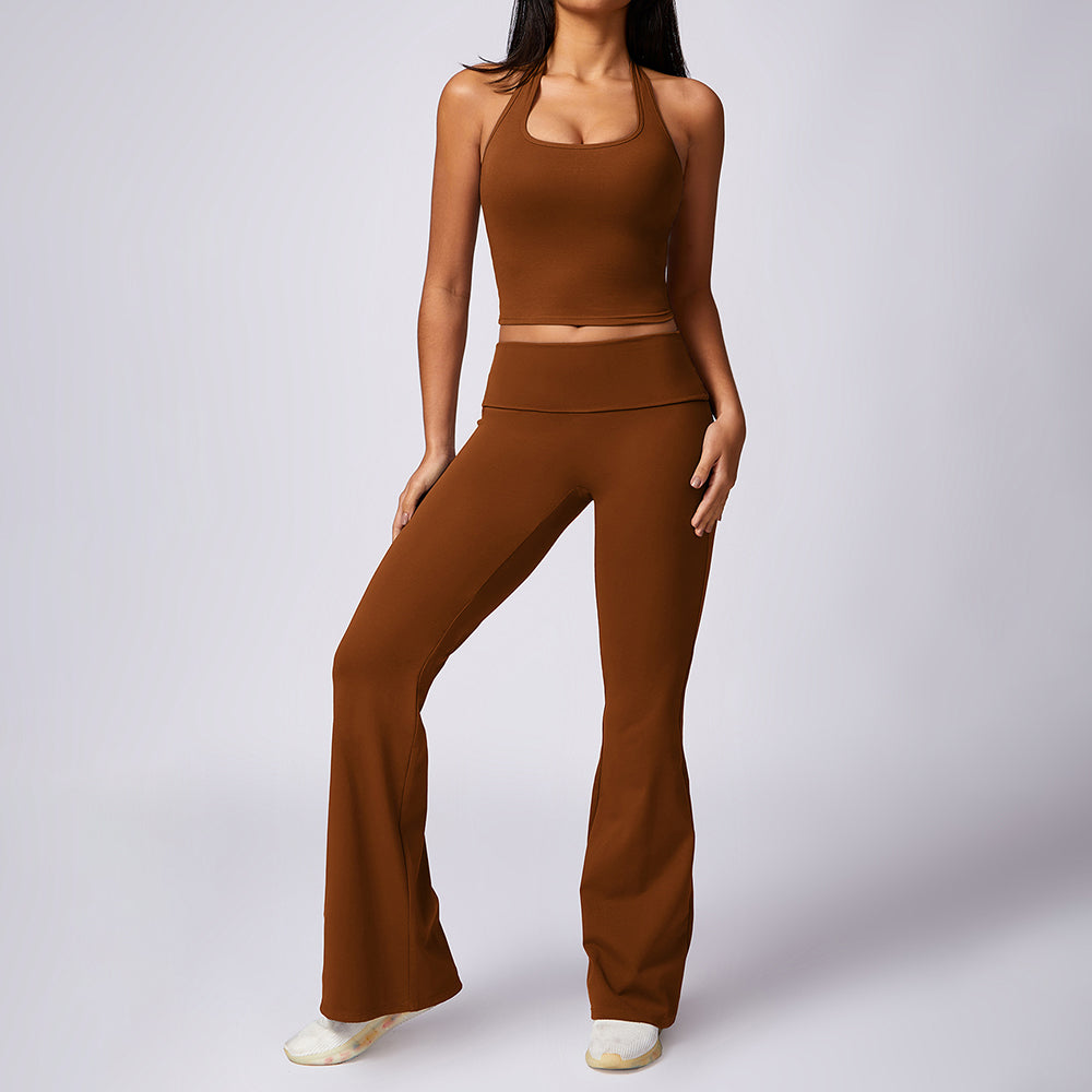 8713 Women Sexy Halter Backless Yoga Vest Fitness High Waist Flared Pants Set