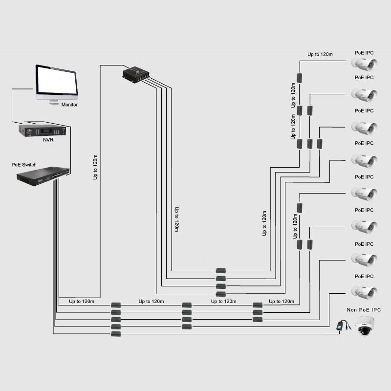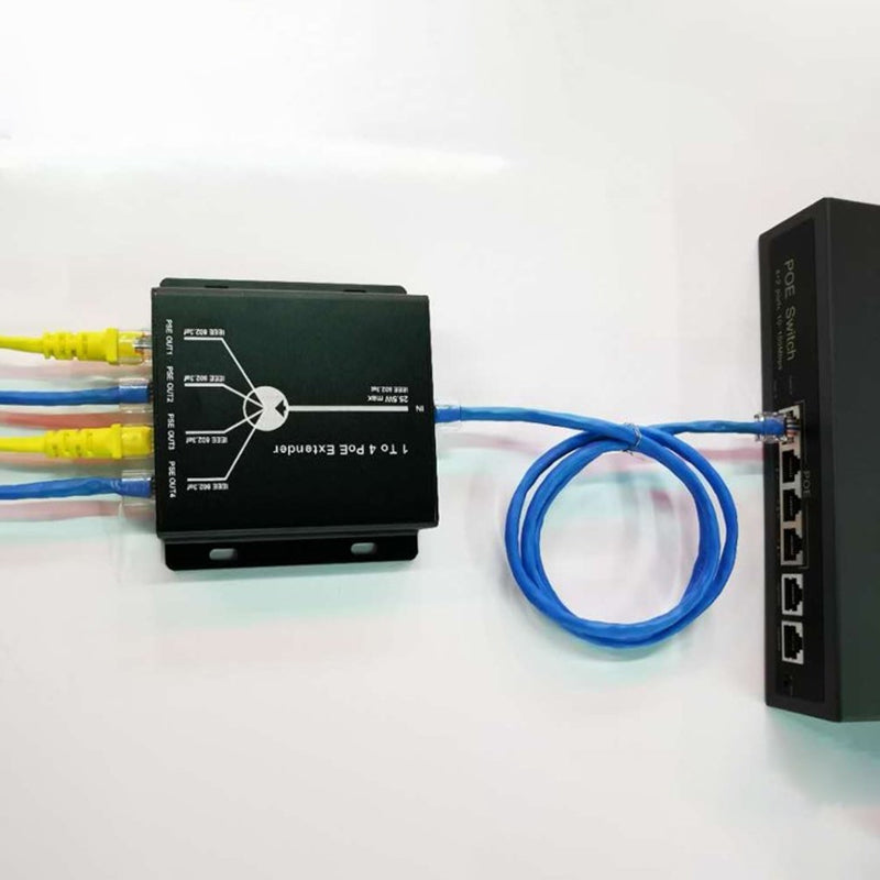 - 1 to 4 Out PoE Extender: 1 x IEEE 802.3at (power-in), 4 x IEEE 802.3af (power-out); 12+, 36- power supply IEEE802.3af/at the protocol