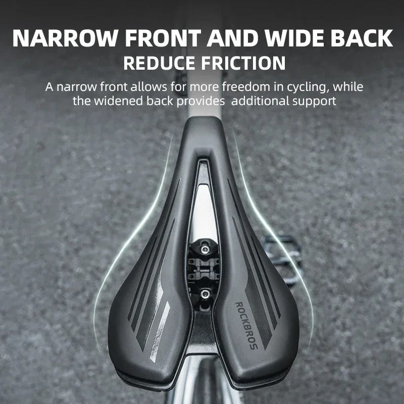 - The seat's tapered shape, wider at the back, prevents leg chafing and offers excellent support. Perfect for extended cycling sessions