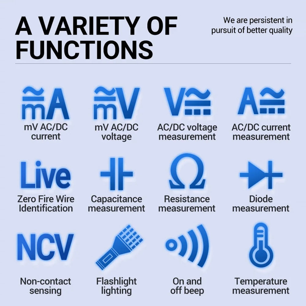 - Intelligent Multimeter with Multiple Functions: it can measure AC/DC current, AC/DC voltage, resistance, capacitance, temperature, frequency, continuity and diode test, fire wire detection, etc.