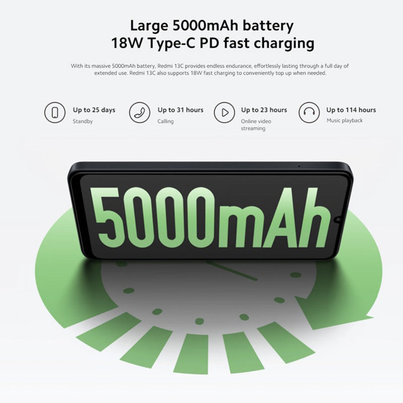 - Extended Battery Life with Fast Charging: Equipped with a 5000mAh battery, the Redmi 13C offers all-day endurance and supports 18W Type-C PD fast charging, ensuring you're quickly back in action when you need a power boost