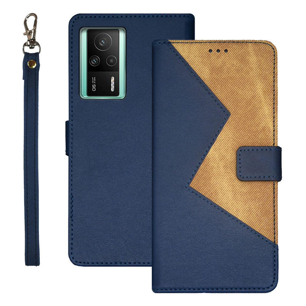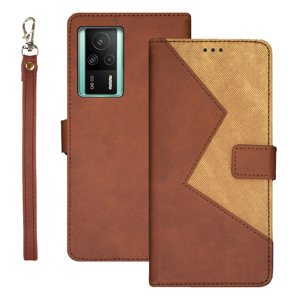 IDEWEI pro Xiaomi Redmi K60E 5G barevné spojování PU kožené magnetické pouzdro na telefon Držák karty Nárazuvzdorný kryt telefonu s popruhem na zápěstí