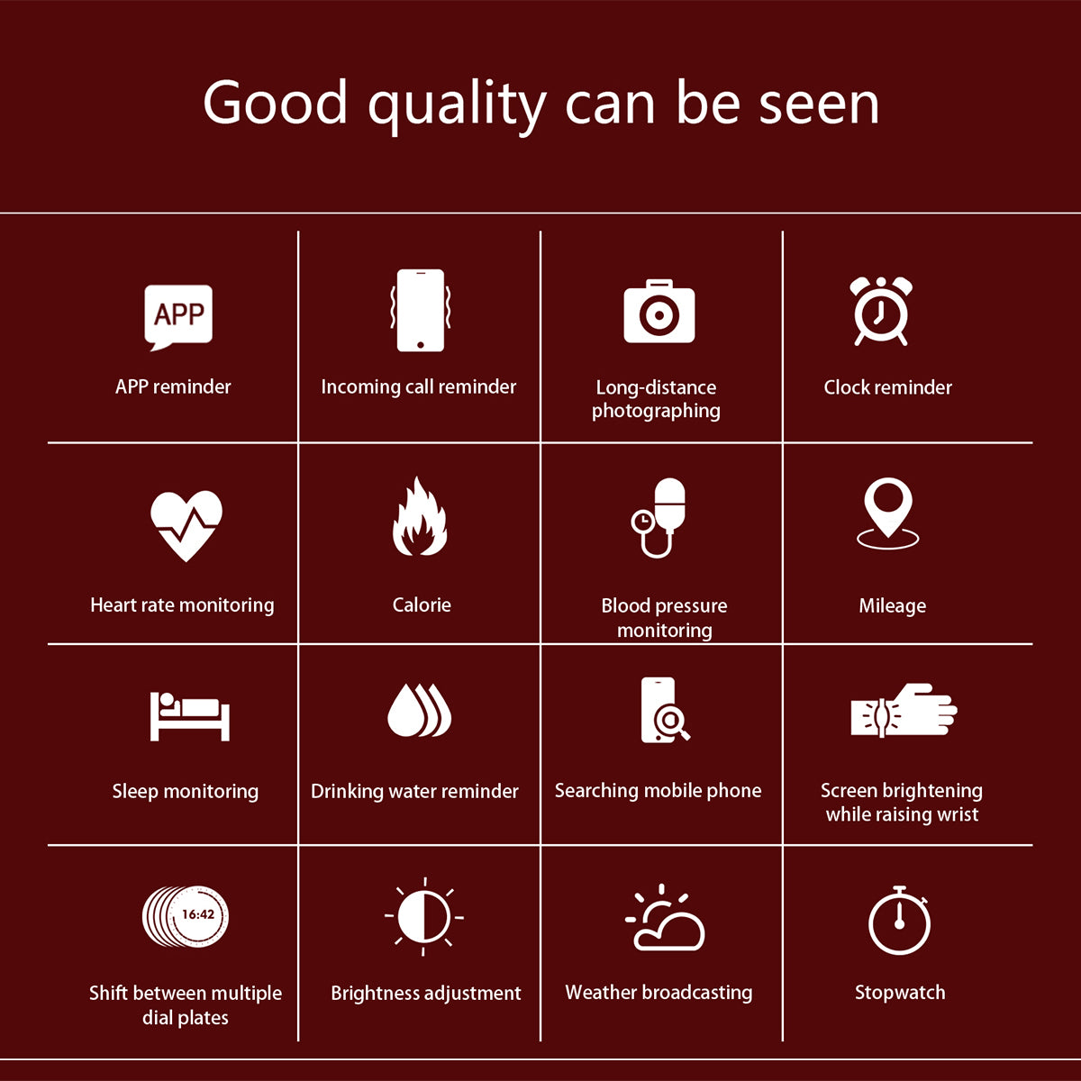 - Zobrazení času a data, počet kroků, kalorie, vzdálenost, zobrazení počasí, stopky, monitorování srdečního tepu (monitorování v reálném čase a načasování – interval 2 hodiny), monitorování krevního tlaku a kyslíku a monitorování spánku (délka spánku a kvalita spánku)