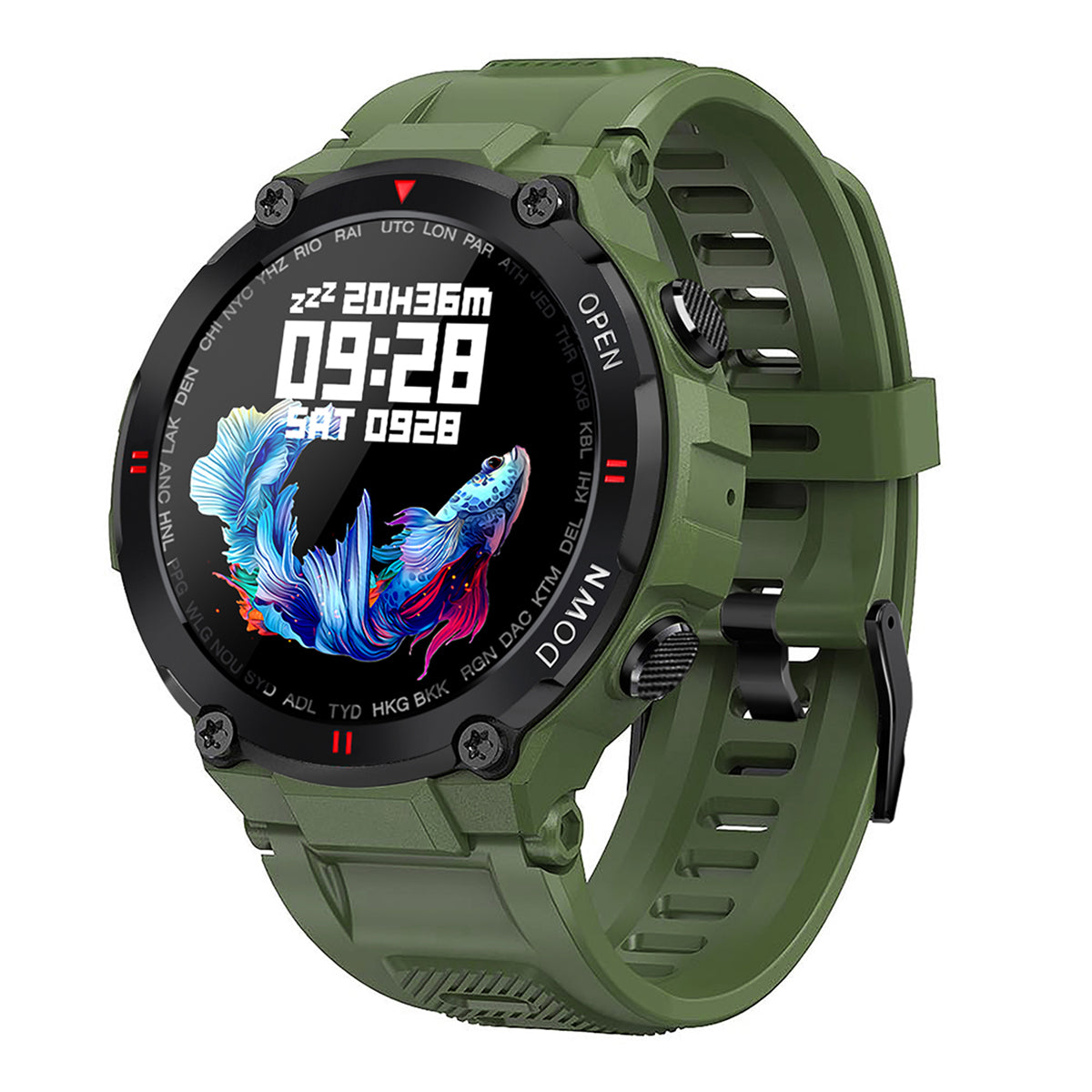 LEMONDA SMART K27 1,28palcové chytré hodinky s kulatým displejem Dámské fyziologické připomenutí IP67 Vodotěsný design Chytré hodinky pro monitorování zdraví – Army Green