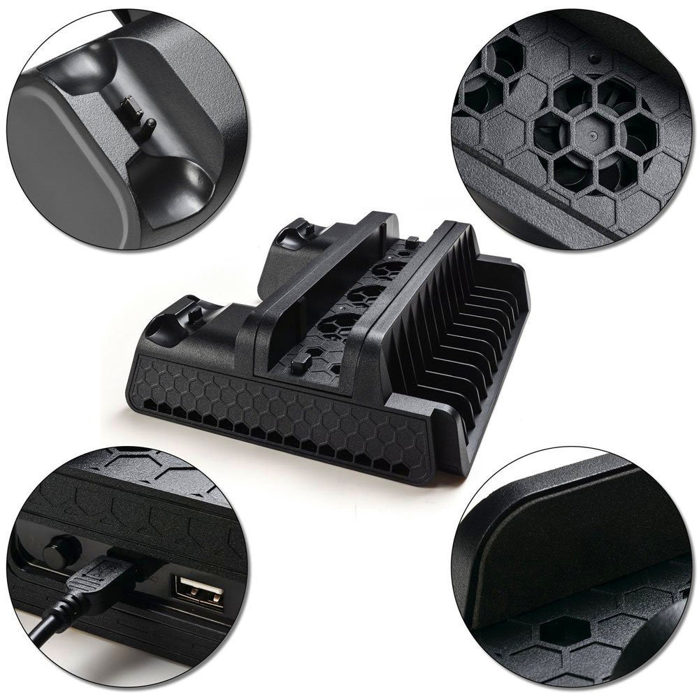 Chladicí ventilátory: Tento vertikální stojan má vestavěné ventilátory, které odvádějí teplo z vaší konzole PlayStation 4 / Slim Console, aby zůstala funkční.