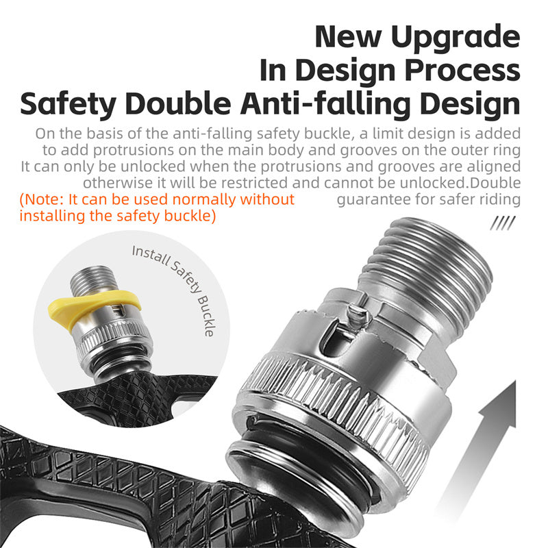 - On the basis of the anti-falling safety buckle, a limit design is added to add protrusions on the main body and grooves on the outer ring. It can only be unlocked when the protrusions and grooves are aligned otherwise it will be restricted and cannot be unlocked. Double guarantee for safer riding