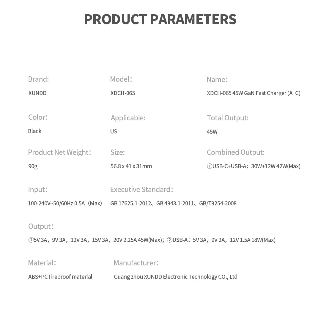- XUNDD XDCH-065 GaN Power Adapter Type-C+USB-A Dual Port 45W Fast Charging Block XUNDD XDCH-065 GaN Power Adapter Type-C+USB-A Dual Port 45W Fast Charging Block