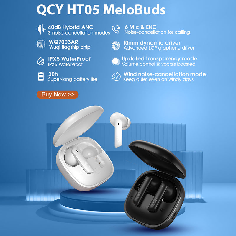 - QCY HT05 Melobuds TWS Bluetooth-øretelefon Trådløst headset Low Delay Musikhovedtelefon med opladningsetui QCY HT05 Melobuds TWS Bluetooth-øretelefon Trådløst headset Low Delay Musikhovedtelefon med opladningsetui