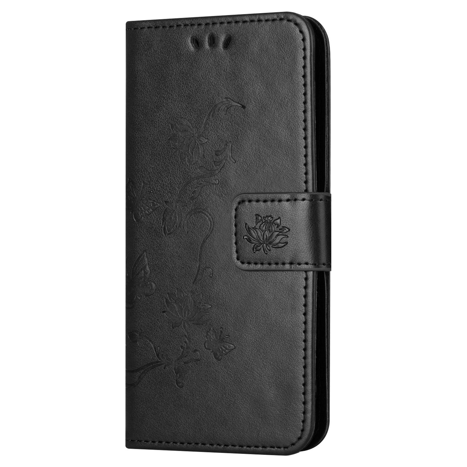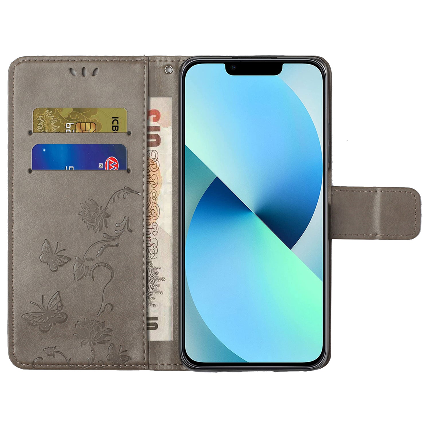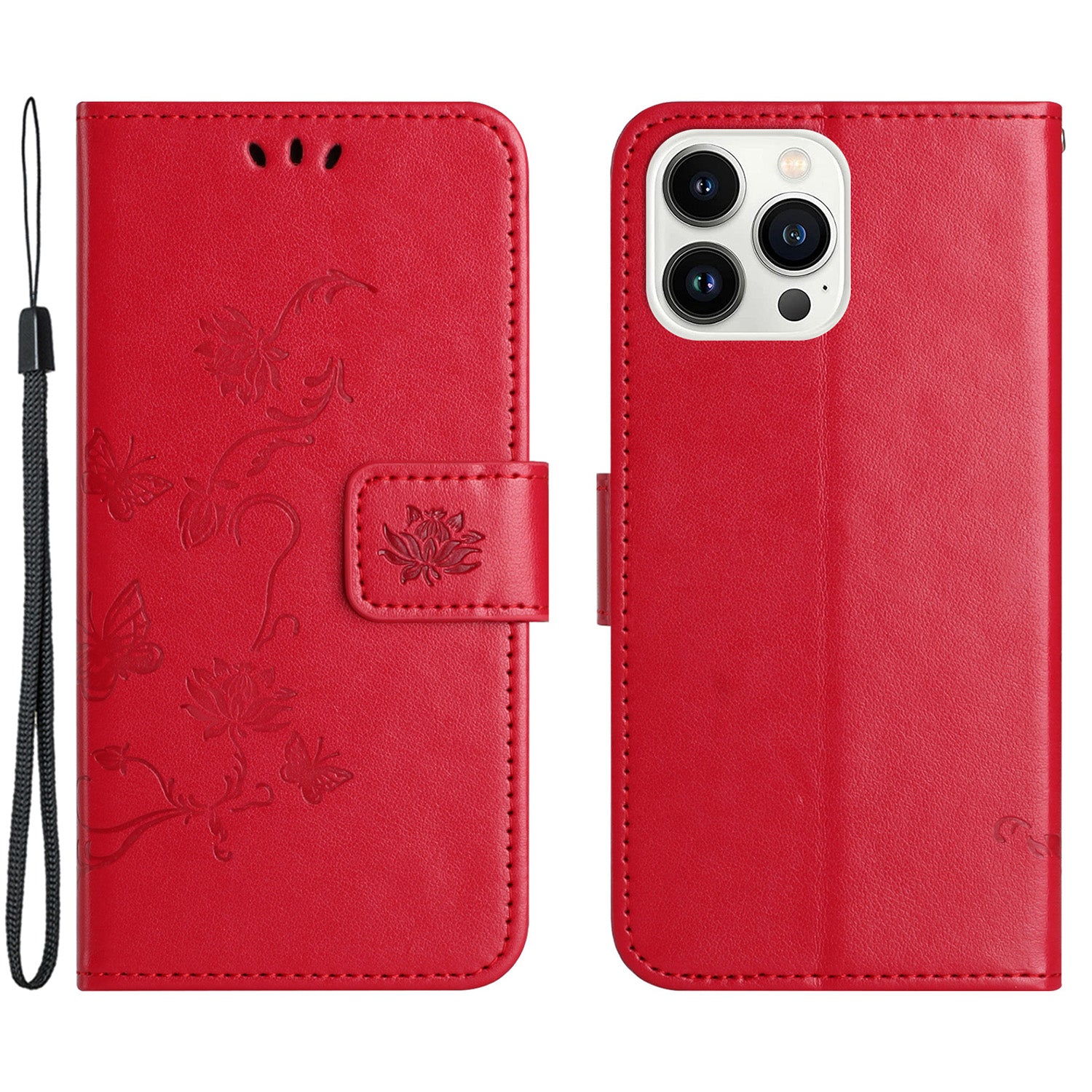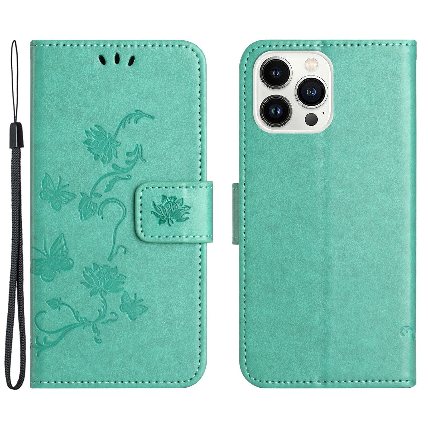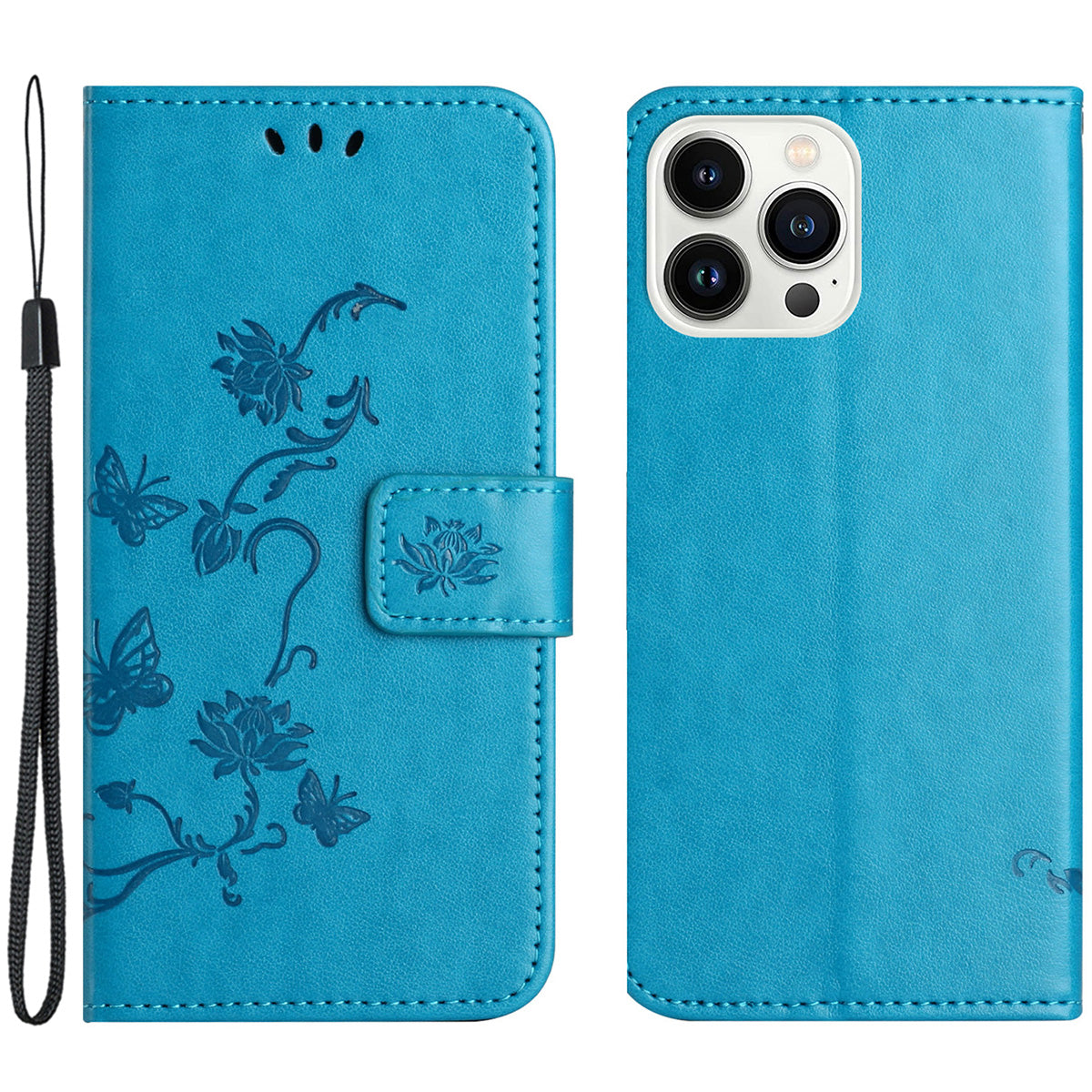Til iPhone 15 Pro Max Ridsesikker PU-læder pung telefonetui Sommerfugleblomst præget stativcover