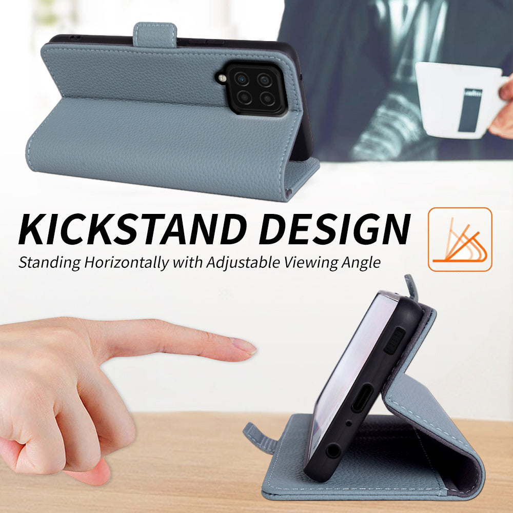 Anti-ridse pung etui til Samsung Galaxy A12 Litchi Texture ægte ko læder stander telefoncover
