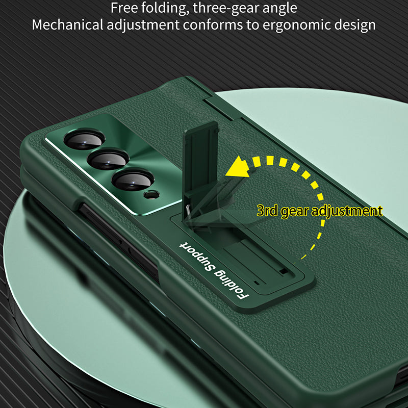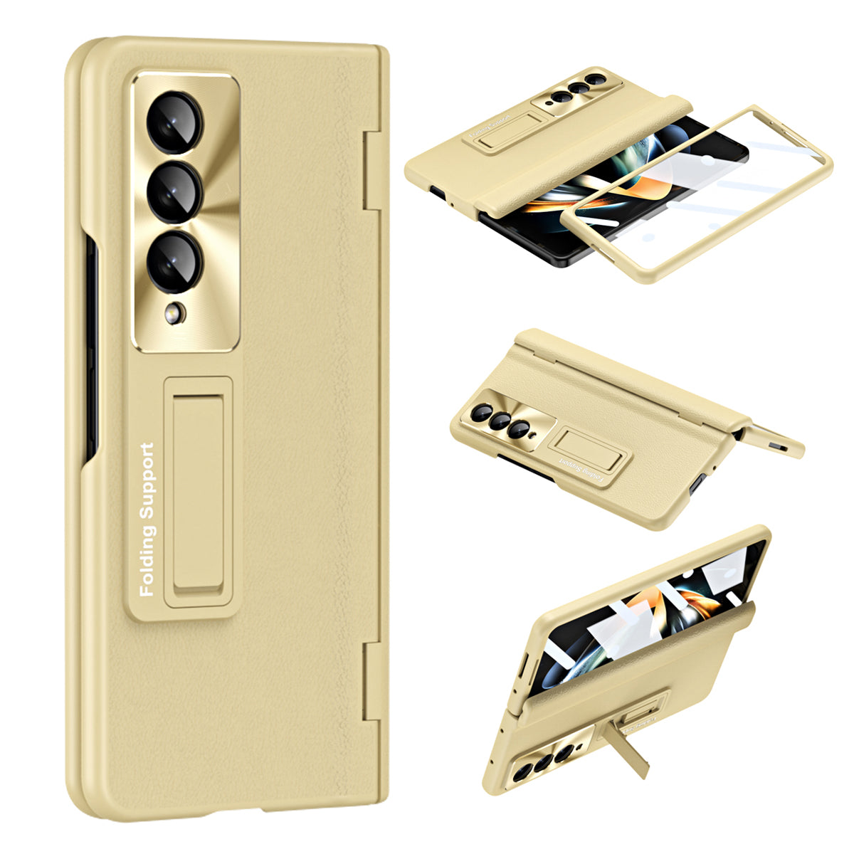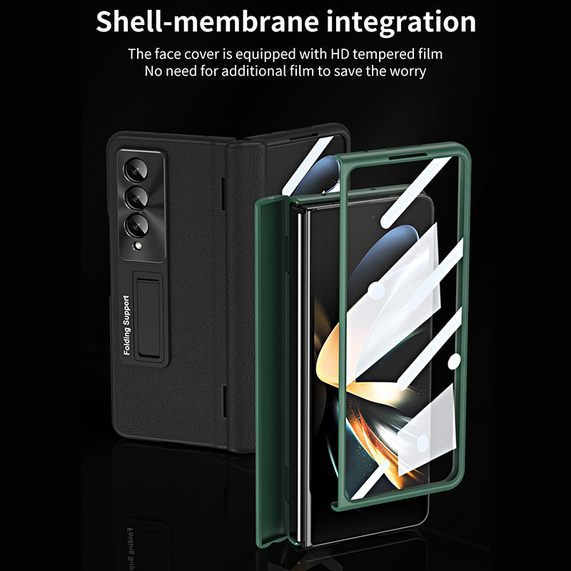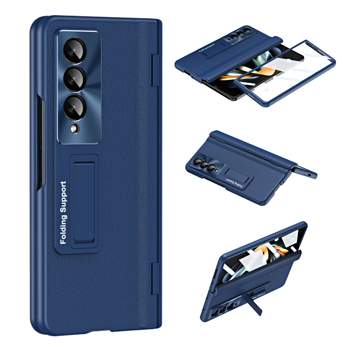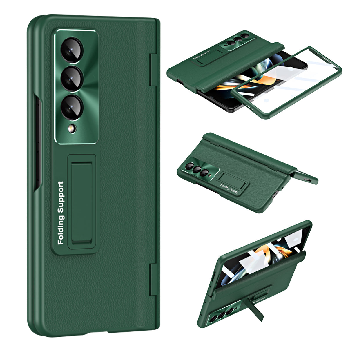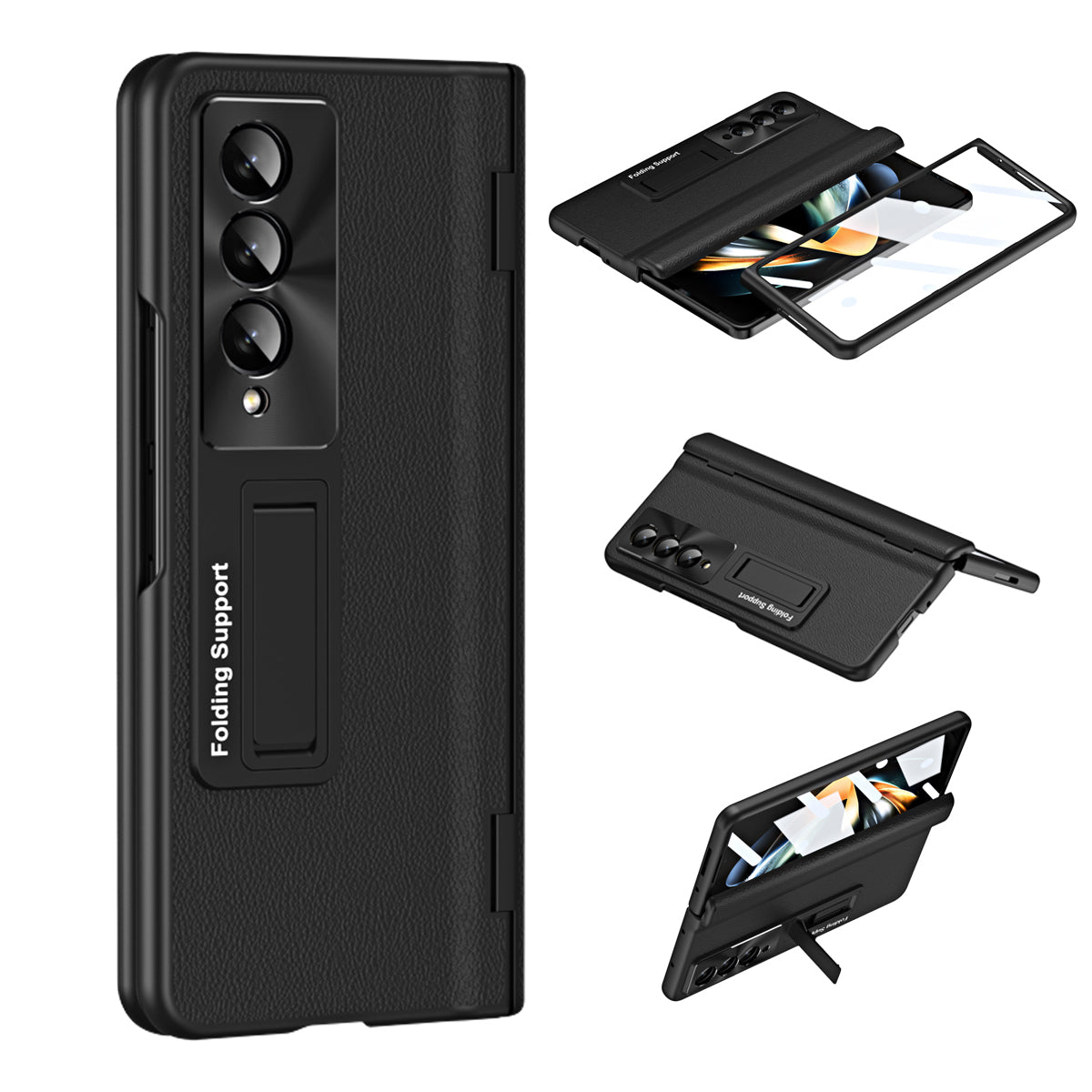 Til Samsung Galaxy Z Fold4 5G Hængselbeskyttelse Telefonetui PU-læderbelagt PC Støttebetræk med hærdet glasfilm