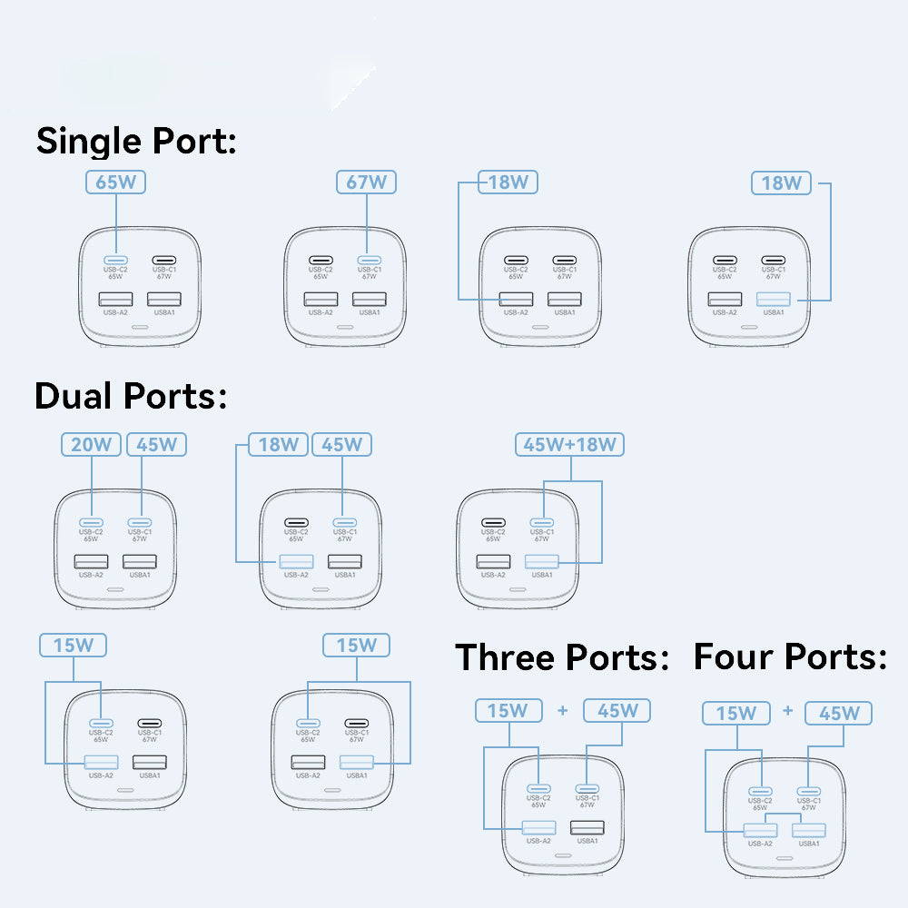 - With 2 USB + 2 Type-C outputs, directly power multiple electronic devices with this charger