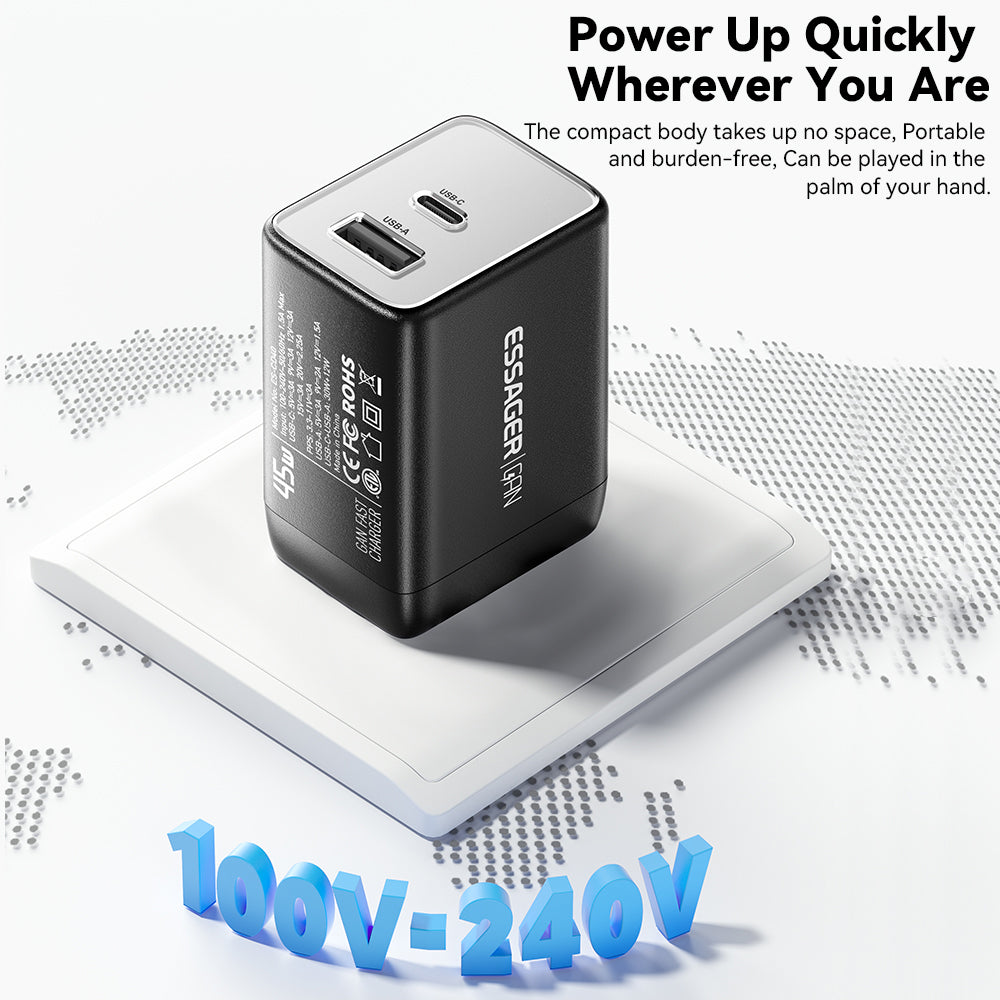 - ESSAGER ES-CD40 45W GaN Travel Charger Type-C + USB-A Phone Tablet Power Adapter ESSAGER ES-CD40 45W GaN Travel Charger Type-C + USB-A Phone Tablet Power Adapter
