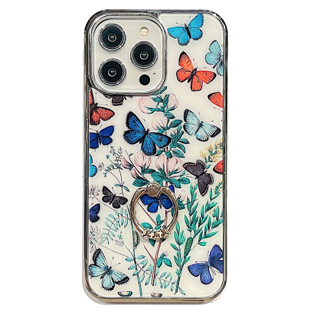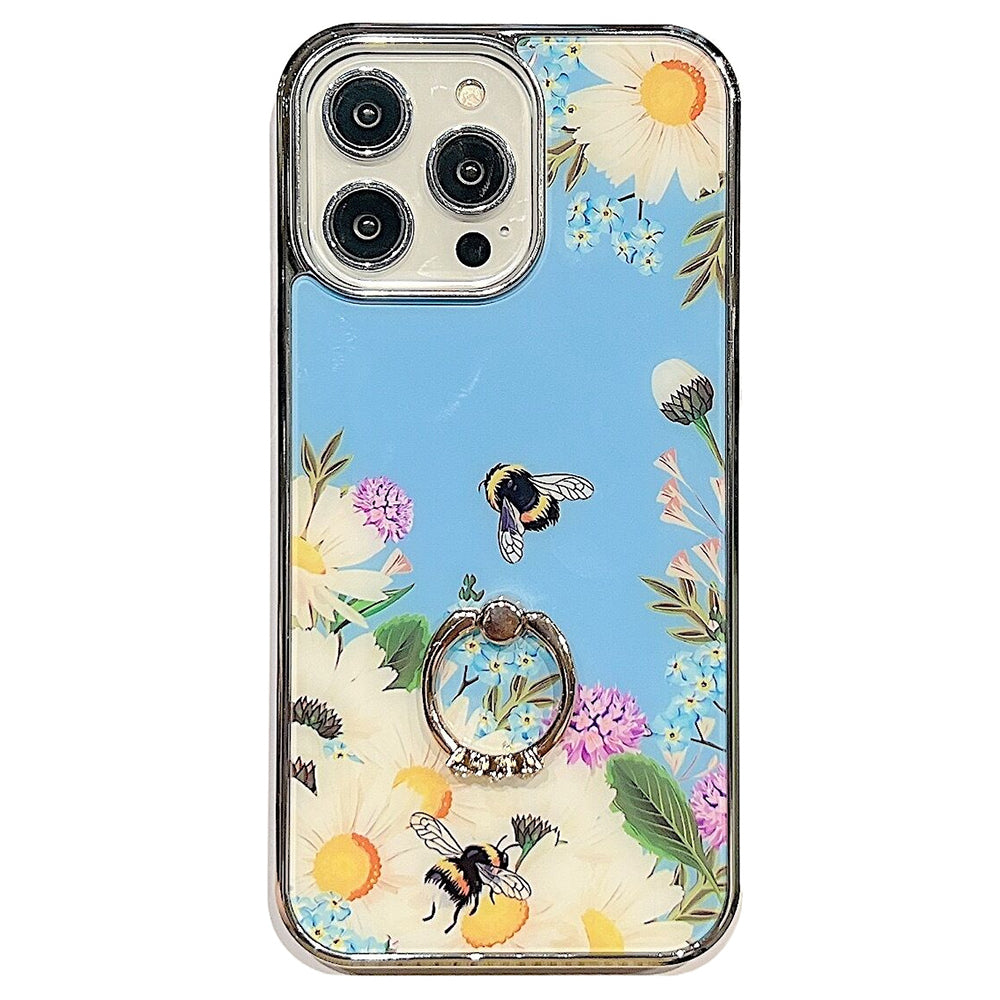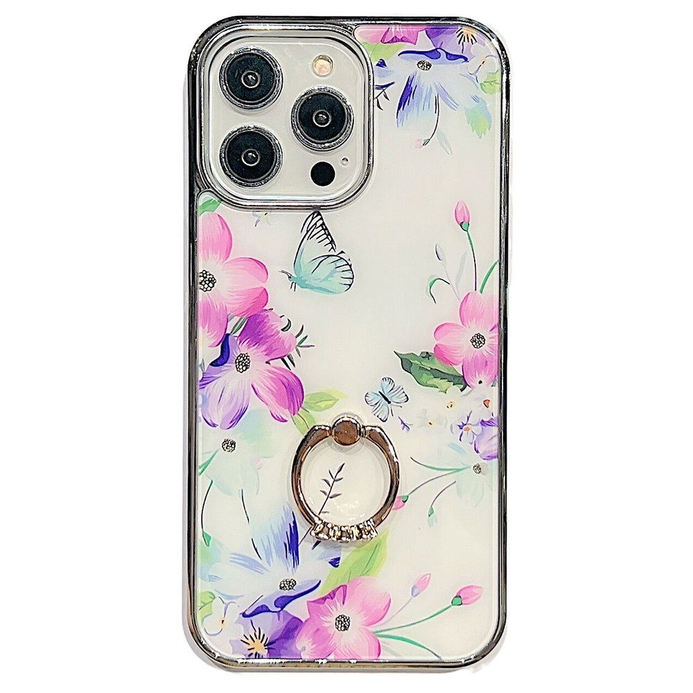 IMD Flower Pattern Phone Case for iPhone 13 Pro Max 6.7 inch Ring Kickstand Electroplating PC TPU Cover
