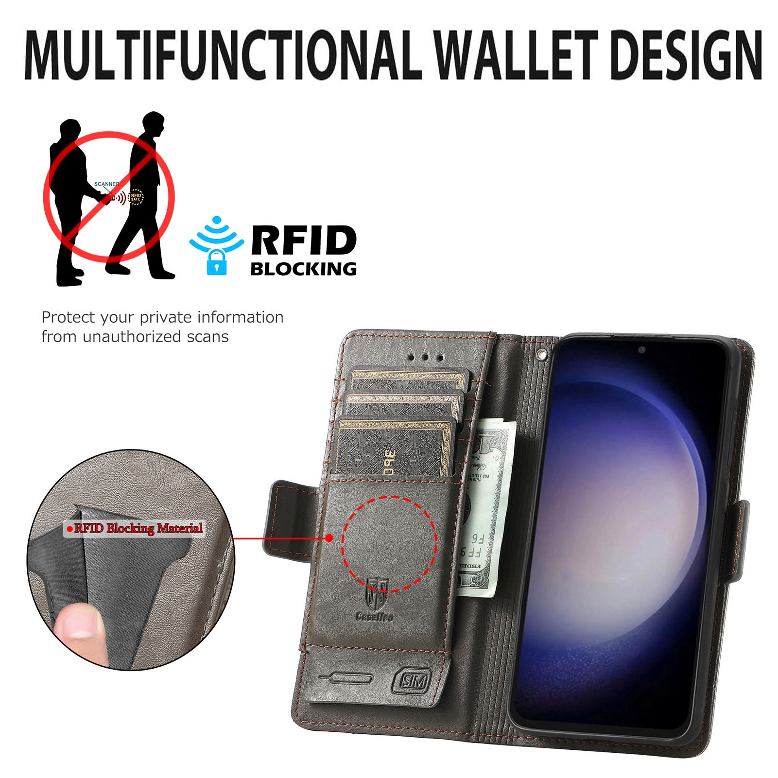 Wallet design, comfortably fits cards plus cash, also can store a SIM card and an ejector pin