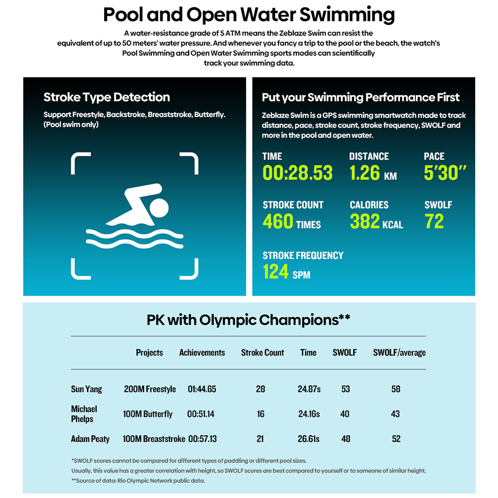 - Pool and Open Water Swimming: A water-resistance grade of 5 ATM means the Zeblaze Swim can resist the equivalent of up to 50 meters of water pressure. And whenever you fancy a trip to the pool or the beach, the watch's Pool Swimming and Open Water Swimming sports modes can scientifically track your swimming data