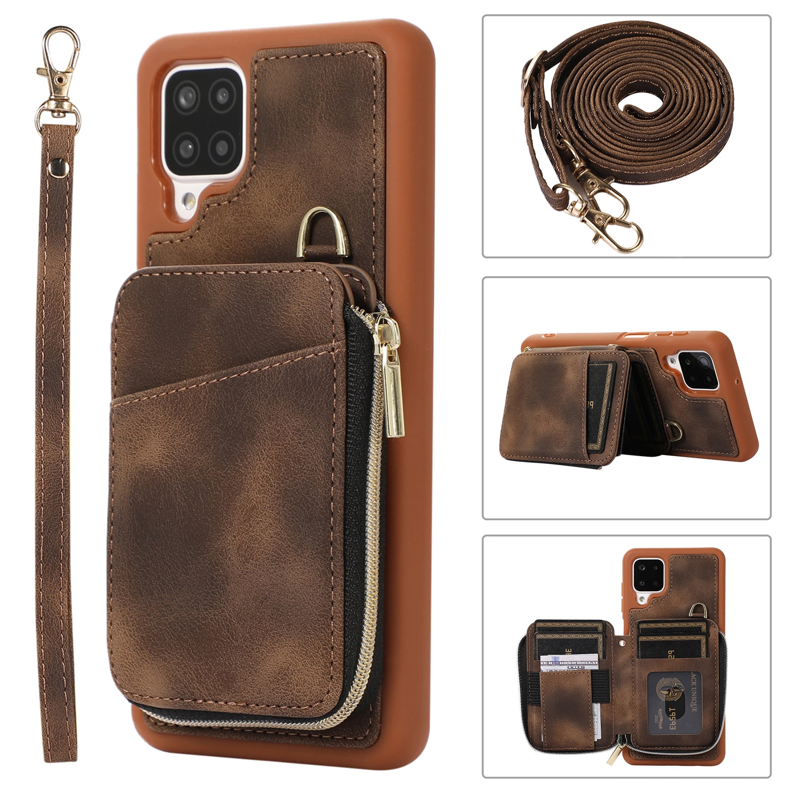 For Samsung Galaxy A12 Card Holder Slots Zipper Pocket Case PU Leather Coated TPU Kickstand Phone Cover