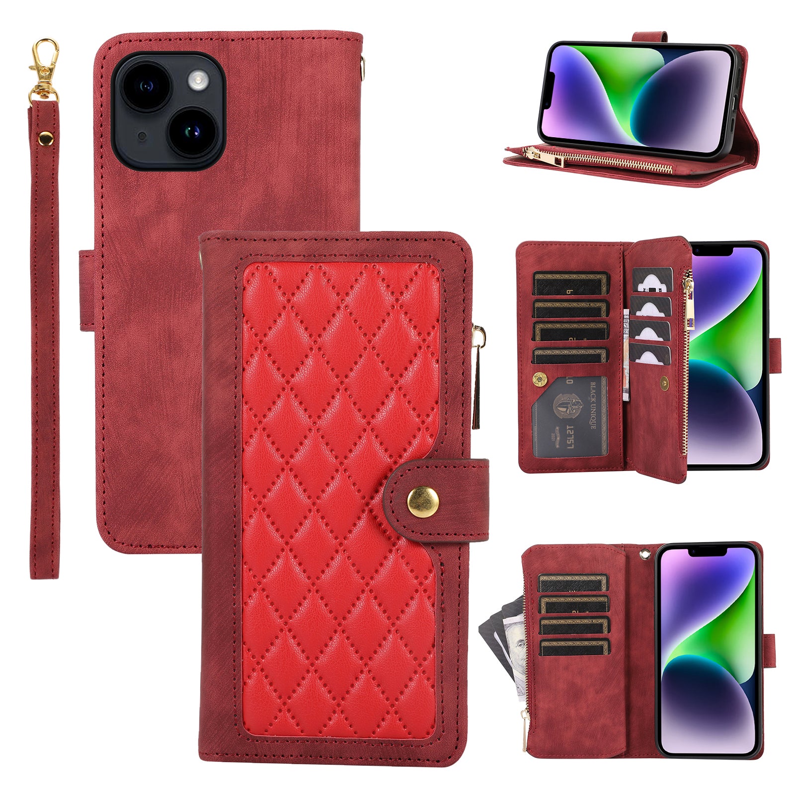 - Multiple Card Slots Zipper Pocket Phone Case for iPhone 14 Rhombus Stand Leather Cover Multiple Card Slots Zipper Pocket Phone Case for iPhone 14 Rhombus Stand Leather Cover