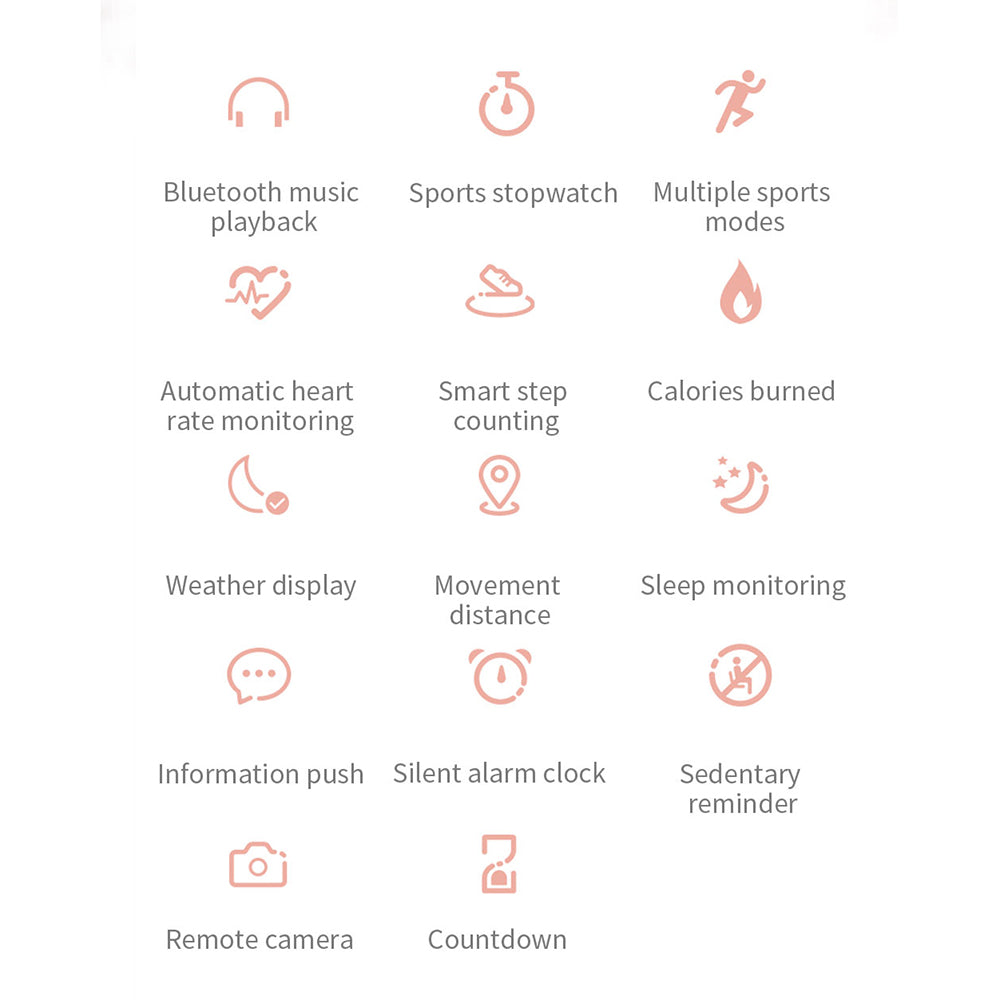 Major function | Breathing light, Reminder push, SMS alerts push, WeChat alerts push, push, remind QQ motion records (step, mileage), sleep monitoring, sedentary reminder, calorie calculation, stopwatch, low battery alert, raising the bright screen, fast charging, low power consumption, heart rate, blood pressure, vibration, exercise mode remote, camera, intelligent alarm, weather forecast | |