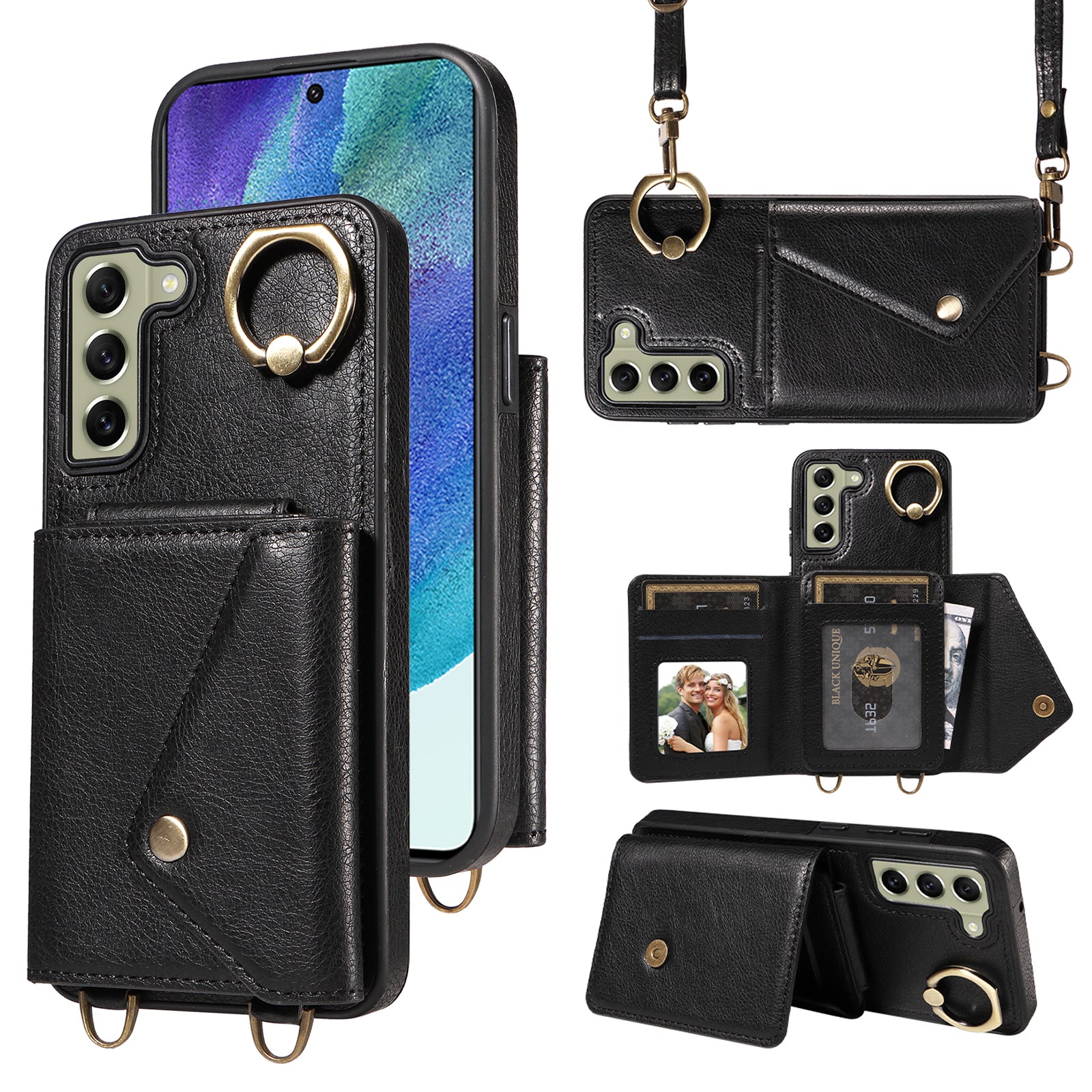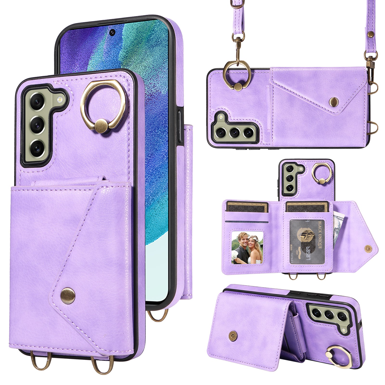 - 002 For Samsung Galaxy S21 FE 5G Card Bag Ring Kickstand Cover Litchi Texture Leather Coated TPU Anti-fall Phone Case with Shoulder Strap 002 For Samsung Galaxy S21 FE 5G Card Bag Ring Kickstand Cover Litchi Texture Leather Coated TPU Anti-fall Phone Case with Shoulder Strap
