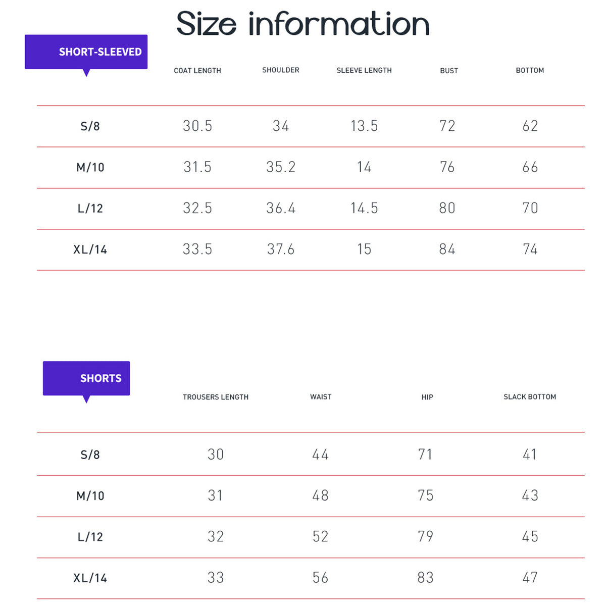 Shorts Pants Size Chart: