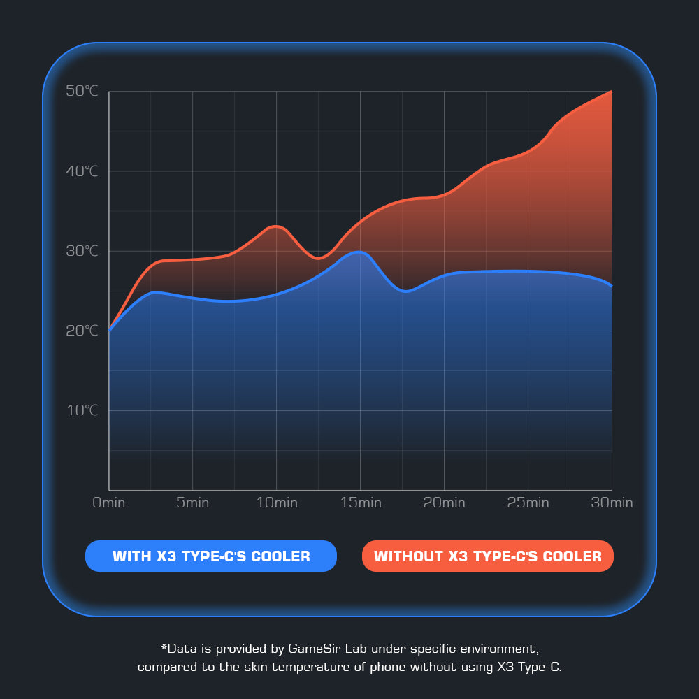 - Phone surface can be cooled by up to 24°C: Based on the Peltier cooling effect, GameSir X3 mobile gamepad comes with a 4000mm⊃2 cooling area on the front, providing a large area of ultra-fast heat dissipation. 128 heat transfer columns help quickly absorb heat from the Peltier modules, while a 7-blade fan spins at 7500 RPM for excellent airflow. With this powerful engineering system, GameSir X3 can even lower the phone's skin temperature by 24°C. The fan also has a noise reduction design, and the noise is only 32dB when working