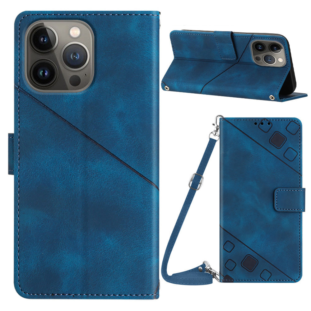 PT005 YB Imprinting Series-7 for iPhone 14 Pro Max PU Leather Wallet Phone Case Imprinted Flip Stand Cover with Shoulder Strap