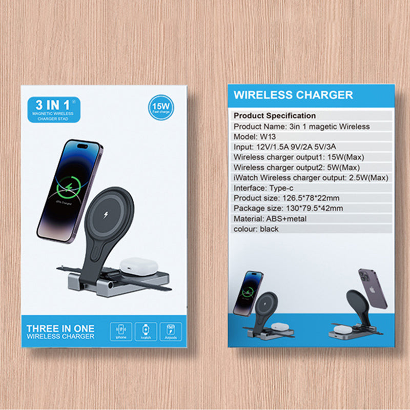 - W13 3-in-1 Magnetic Wireless Charger Portable Folding Charging Station for iPhone 12 / 13 / 14 / 15 Series, AirPods, iWatch W13 3-in-1 Magnetic Wireless Charger Portable Folding Charging Station for iPhone 12 / 13 / 14 / 15 Series, AirPods, iWatch