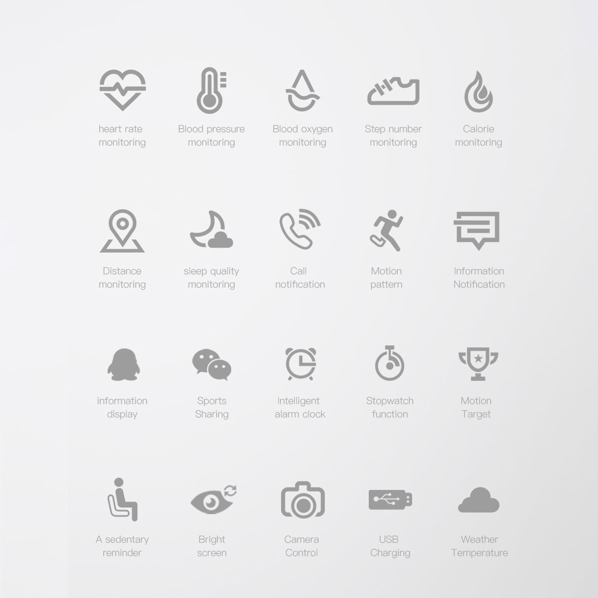 - Heart rate monitoring, blood pressure, blood oxygen detection, sleep monitoring, weather display