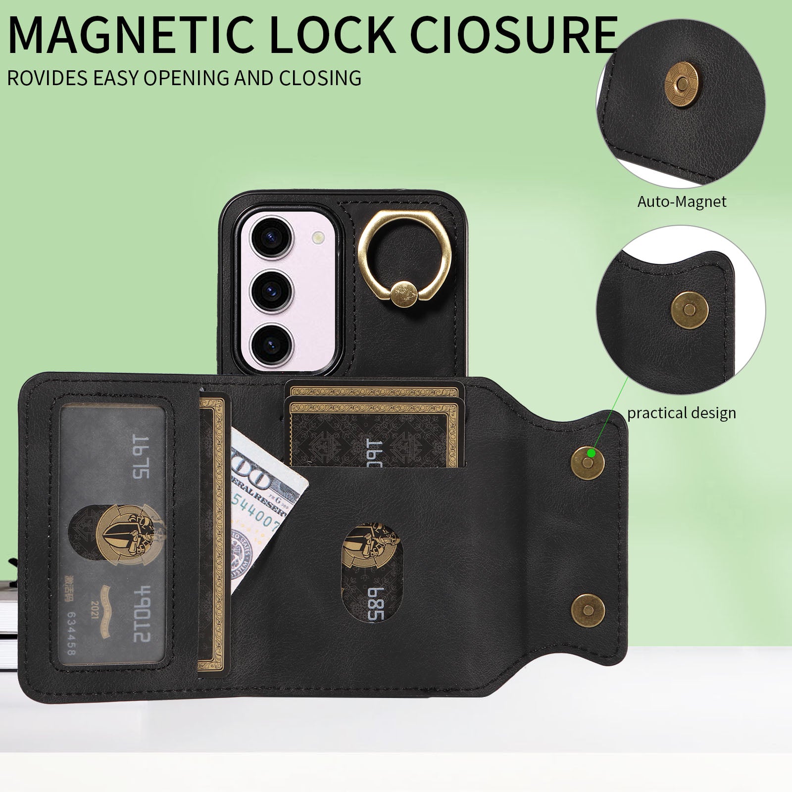 - Magnetic lock closure to keep your cards and money safe. Built-in eject pin and SIM card slot (not included)