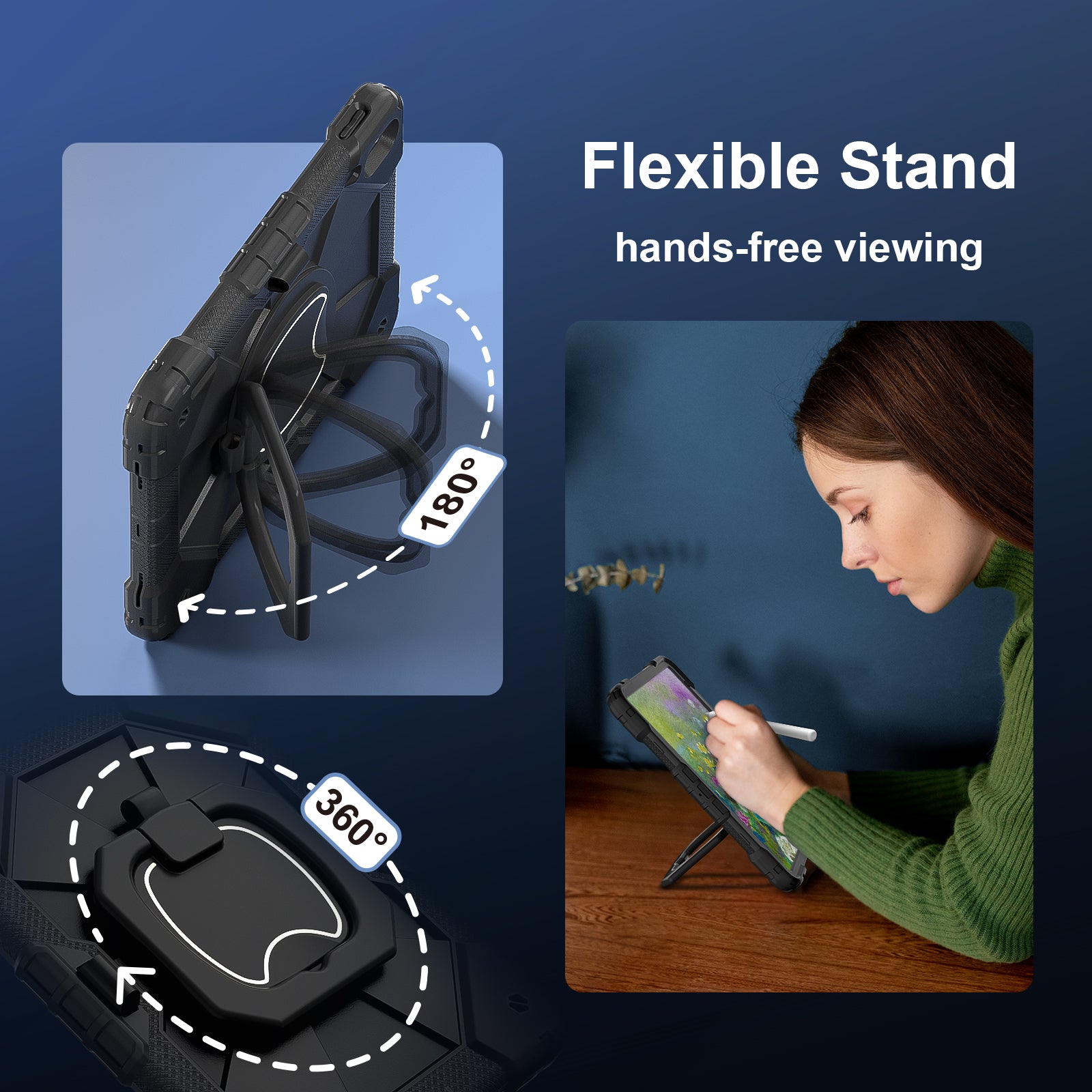 Impact-resistant design and shock-absorbing silicone + plastic materials fully cover the back and edges, protecting against accidental drops and falls. The convenient adjustable but sturdy kickstand fully frees your hands when you're reading, watching, and surfing the internet in your free time.