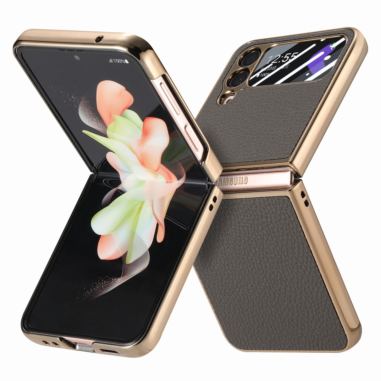 - For Samsung Galaxy Z Flip4 5G Electroplating Phone Case Litchi Texture Leather PC Cover with Tempered Glass Rear Screen Film For Samsung Galaxy Z Flip4 5G Electroplating Phone Case Litchi Texture Leather PC Cover with Tempered Glass Rear Screen Film
