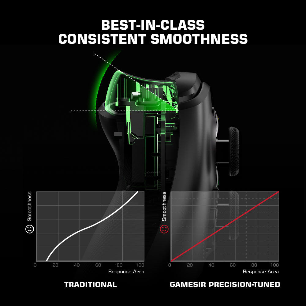 - Best-In-Class Consistent Smoothness: GameSir precision-tuned tech in the Hall Effect analog triggers delivers best-in-class consistent smoothness and precision, reacting to even the slightest adjustment of your fingertips thanks to the pioneer Hall Effect technology. For FPS and action gamers, there¡¯s even a quick switch to Hair Trigger Mode by holding M+LT/RT buttons until the controller vibrates. Whether you need precise linear control or ultimate responsiveness, G7 controller gives you the competitive edge as you need