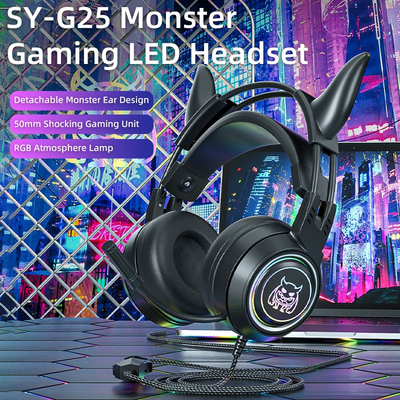 - SY-G25 Devil Ears Design RGB Lighting Wired Control Gaming Earphone 3D Surround Sound Game Headset with HD Mic SY-G25 Devil Ears Design RGB Lighting Wired Control Gaming Earphone 3D Surround Sound Game Headset with HD Mic