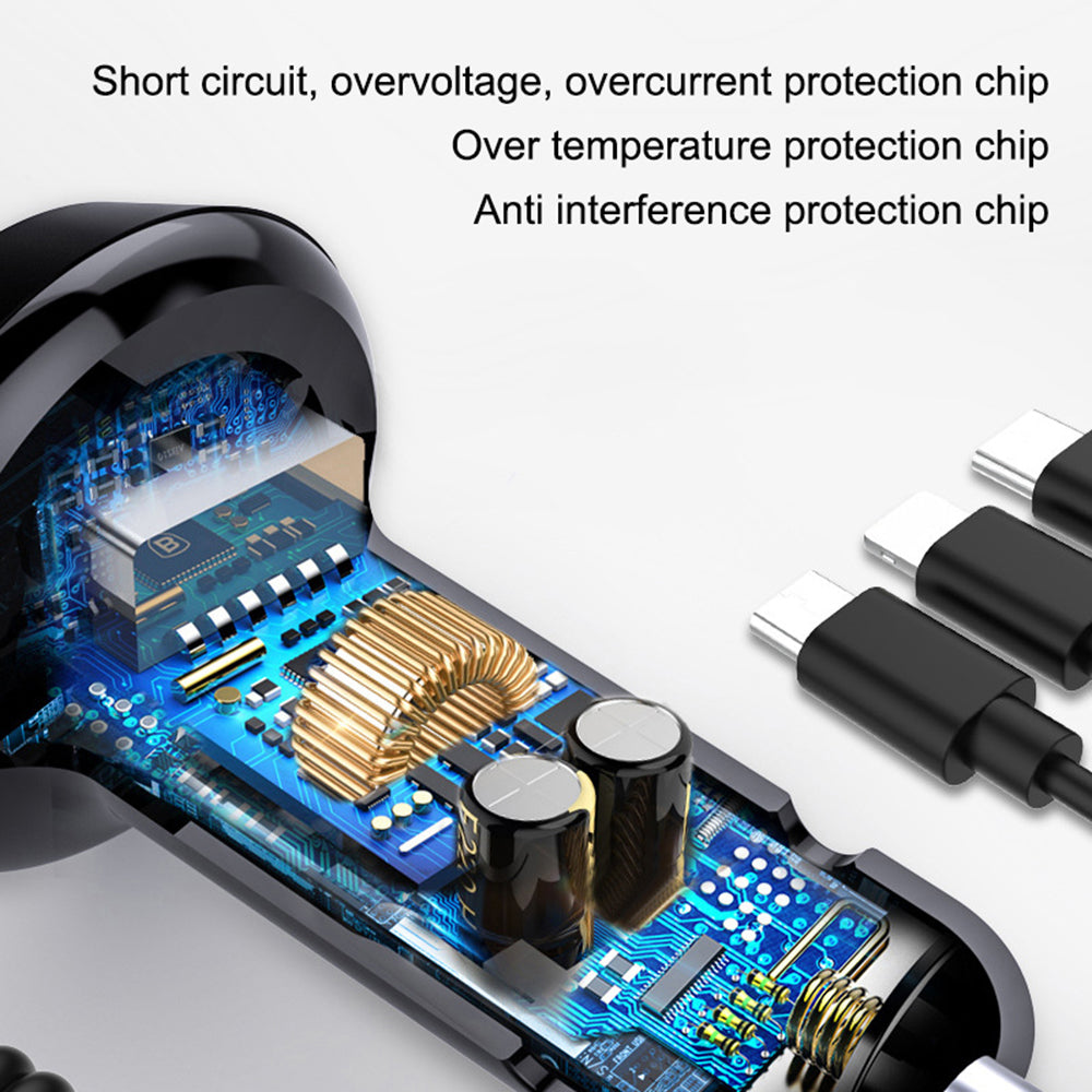 R3XK QC3.0 USB Phone Charging Adapter Digital Display Car Charger with 3-in-1 Spring Cable