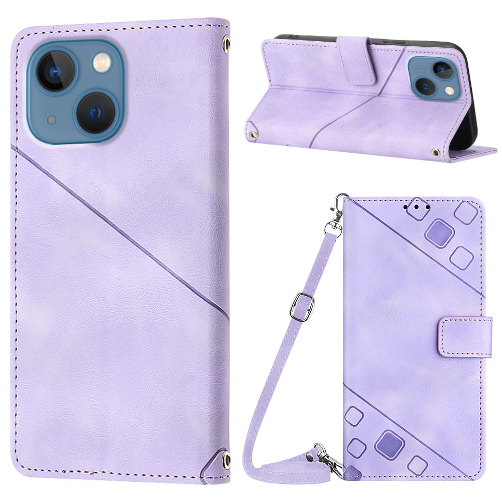 PT005 YB Imprinting Series-7 for iPhone 15 Plus PU Leather Cover Wallet Stand Phone Case with Shoulder Strap