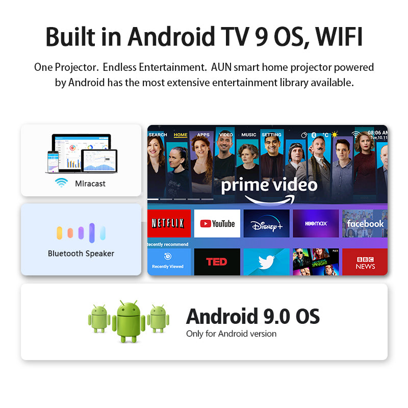 - AUN A001 Pro Portable Projector Android 9.0 WiFi HD Video Screen Mirroring Home Theater Mini LED Projector (Android Version) AUN A001 Pro Portable Projector Android 9.0 WiFi HD Video Screen Mirroring Home Theater Mini LED Projector (Android Version)