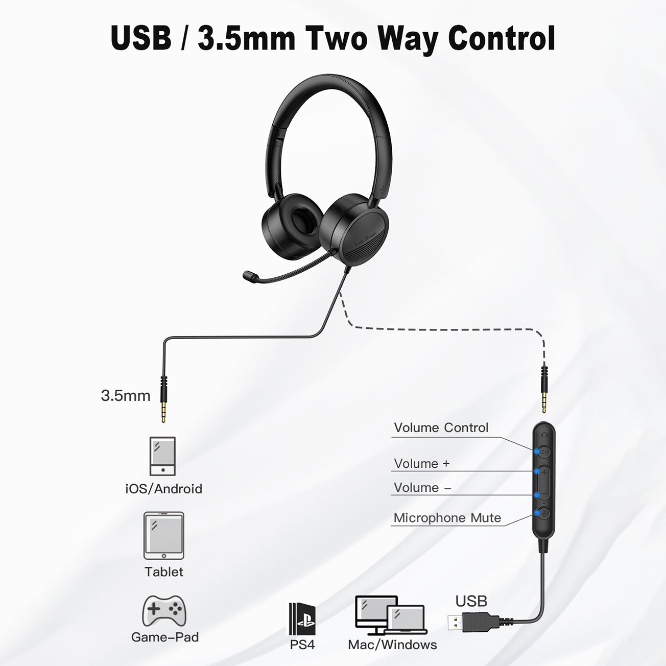 - LINK DREAM H360 USB Headset with Microphone for Computer 3.5mm Earphone Mute Noise Cancelling Call Center Headphones LINK DREAM H360 USB Headset with Microphone for Computer 3.5mm Earphone Mute Noise Cancelling Call Center Headphones