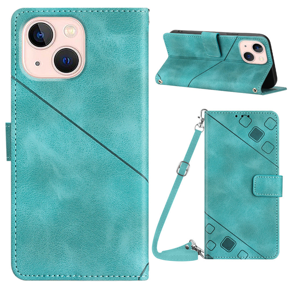 PT005 YB Imprinting Series-7 for iPhone 13 mini Phone Case Imprinted Lines Leather Wallet Stand Cover with Shoulder Strap